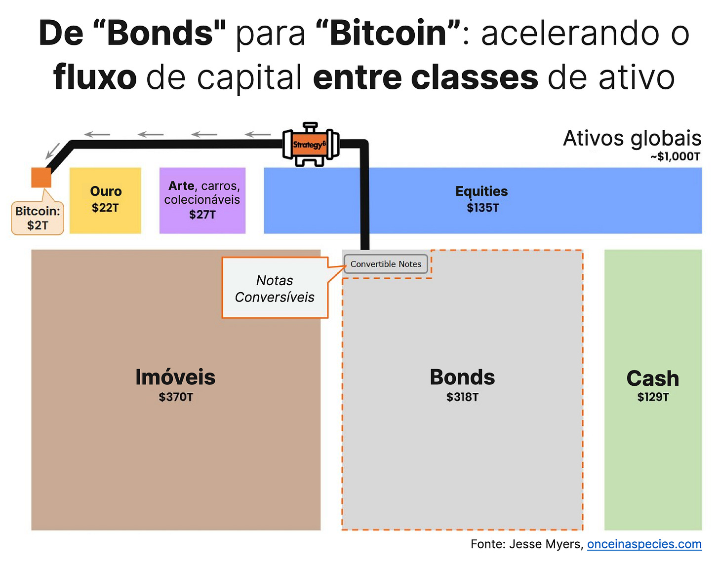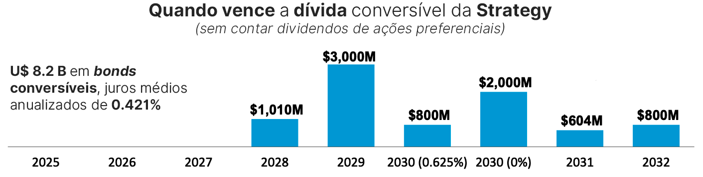 6 meses depois da primeira compra, a MSTR emitiu notas conversíveis (convertible bonds). Nestas, o comprador (credor) recebe juros (o “cupom” do bond) mais um “dividendo” a ser pago quando o instrumento expira, alguns anos no futuro. Esse dividendo pode ser pago em cash ou em ações, caso elas valham "X" na data da expiração.