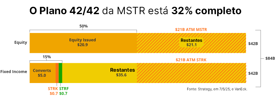 Em maio de 2025, a Strategy já havia emitido todas as ações do plano original, e um terço do montante estipulado de dívida. Sendo assim, dobrou o plano: de U$42B para U$84B. A meta agora é vender mais U$21B de MSTR a mercado, e mais U$35B de instrumentos híbridos de divida.
