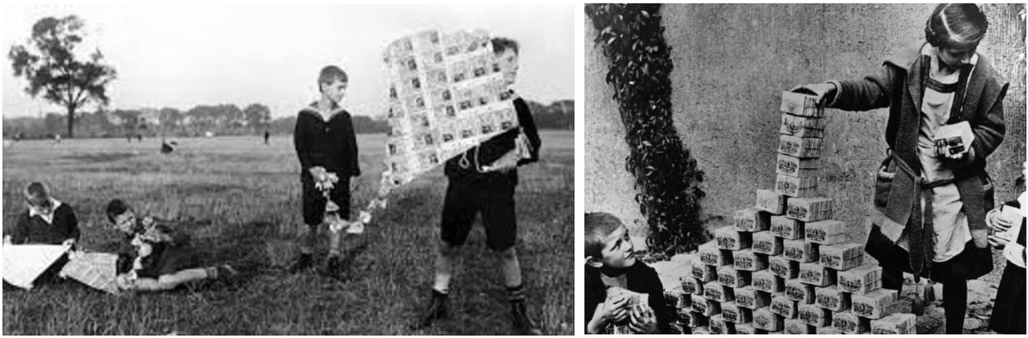 Crianças brincando com notas do Marco Alemão nos anos 1920.