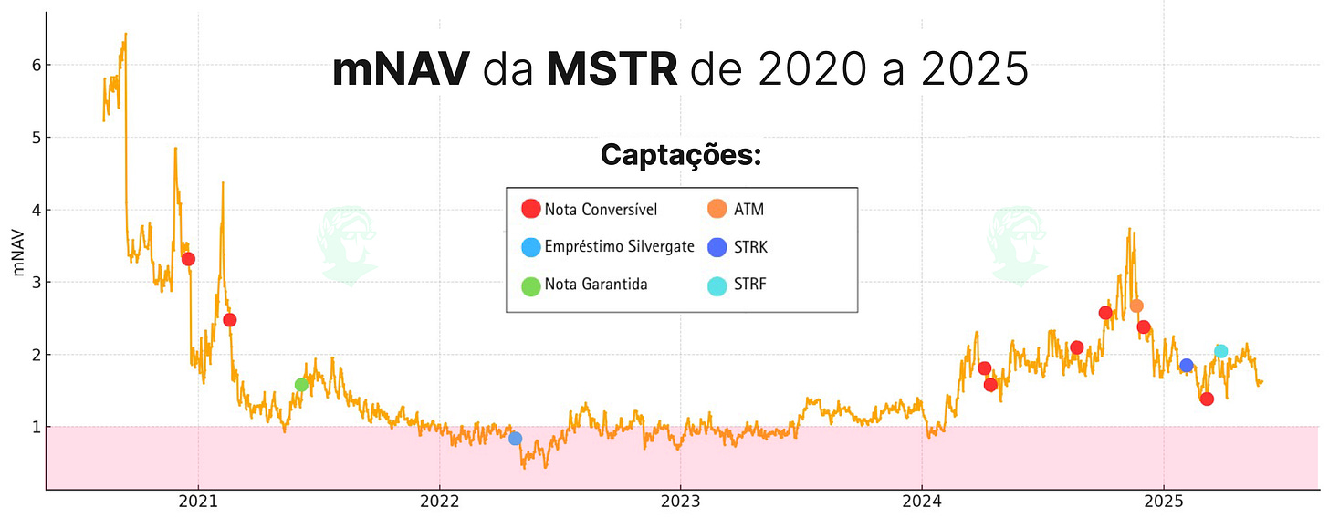 Outros dois indicadores importantes no jargão sayloriano são o NAV e o mNAV. NAV é o valor em dólares dos BTC que a companhia detêm. mNAV é o market cap dividido pelo NAV, isto é, o prêmio ou desconto que o mercado atribui aos bitcoin da empresa.