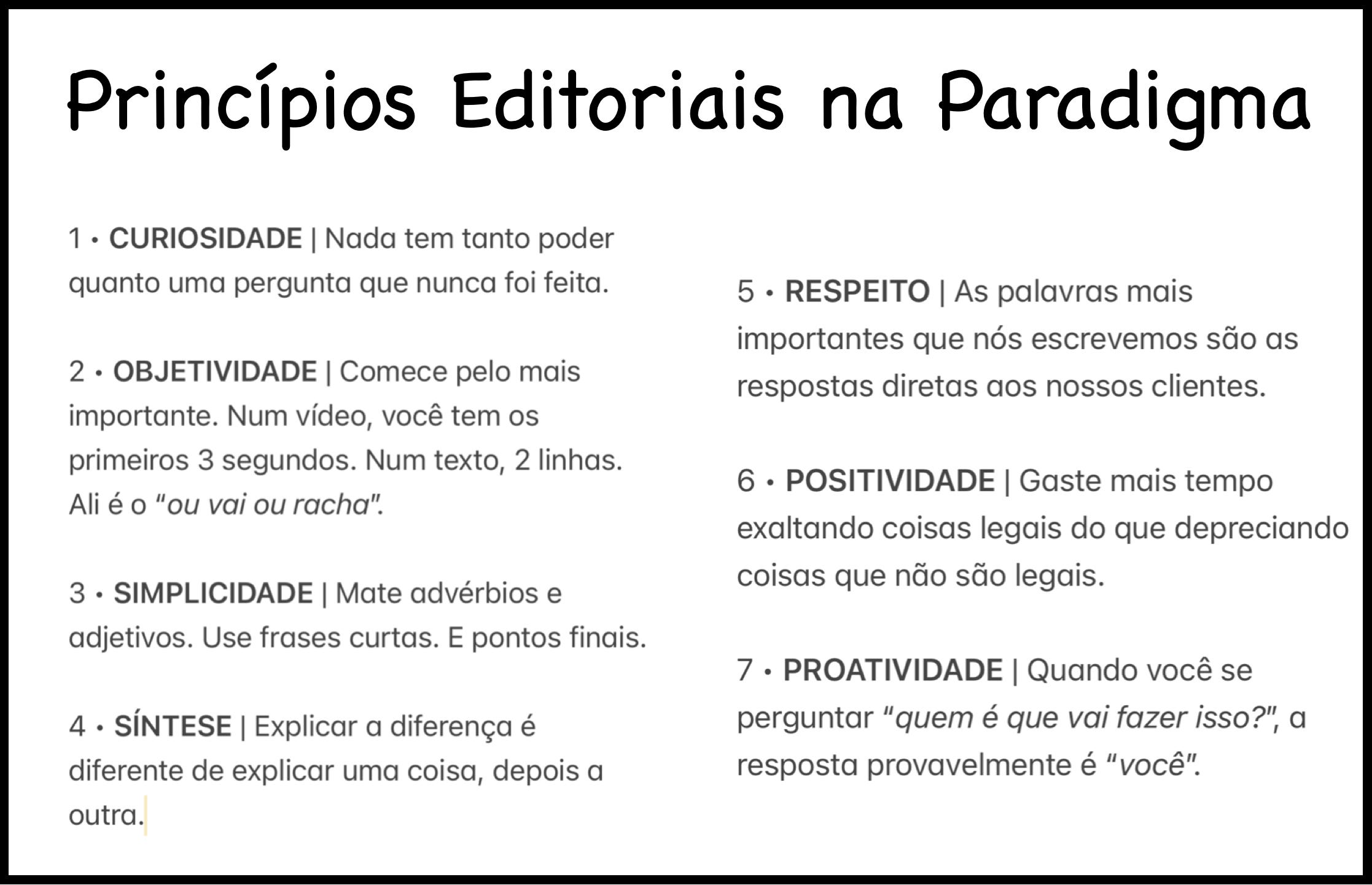 Tudo que o time da Paradigma escreve deve seguir estes princípios. Se você ver alguma mensagem nossa quebrando a coesão, pode nos cobrar.