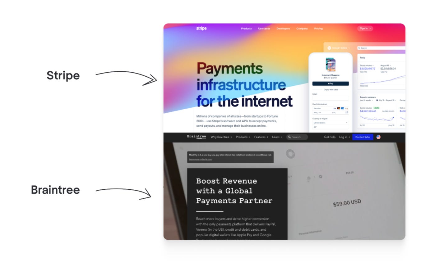 O site da Stripe (o processador de pagamentos) versus o de um dos seus concorrentes. Qual te parece ter mais bom gosto?