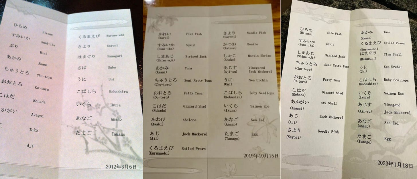 Este é o cardápio do restaurante do Jiro. Repare nas datas: ao longo de 11 anos, o formato não mudou. Note a simplicidade: não tem firula; só os peixes frescos do dia.