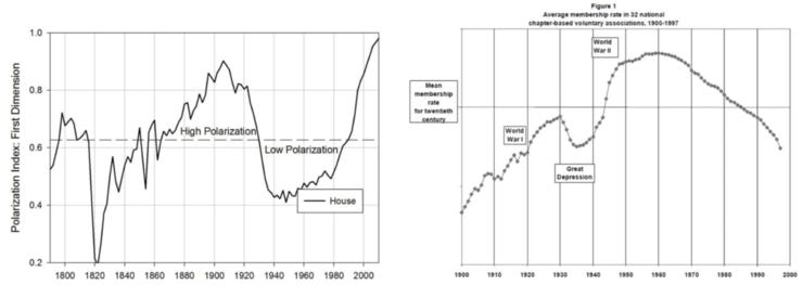 A pesquisa dele é centrada nos ciclos de cooperação e cisão entre classes sociais e elites políticas. Argumenta que estamos em uma tendência declinante nos níveis de cooperação (abaixo, à direita) - alimentada por desigualdade -, o que acarreta índices recorde de polarização política (à esquerda).