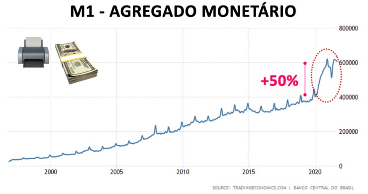 Dependendo de como se mede, algo entre 30% e 50% dos reais em circulação foram criados entre depois de 2020. Lembra da Lei da Oferta e Demanda? Quanto mais dinheiro tem no mercado, menos a unidade de dinheiro vale.